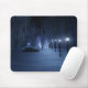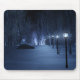 Um caminho coberto de neve que percorre a floresta de pássaros em uma noite escura de inverno. O caminho é alinhado com postes que exibem um brilho azul prateado, mas nas sombras estão formas brilhantes e mesmerizantes como pequenas luzes de fada, atraindo o viajante para fora da trilha. À distância, o brilho lavanda de uma misteriosa floresta se juntando ilumina o céu frio.