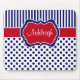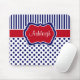 Estas listras vermelhas, brancas, e azuis modernas com mousepad do teste padrão de bolinhas têm uma caixa do modelo para você personalizar com seu próprio nome, iniciais, monograma, ou o outro texto. Se você precisa alguma ajuda que personaliza este mousepad na moda, envie por correio electrónico por favor niteowlstudio@gmail.com.
