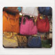 Coleção colorida de bolsos de couro italianos num mercado em Roma, Itália.