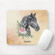Um mouse pad com uma bela ilustração de uma cabeça de cavalo preta com um rico de ornamento floral ao lado do pescoço. Pintura de animais elegante e elegante.