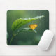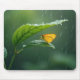 Uma delicada borboleta laranja repousa sobre uma folha verde em meio a quedas de chuva, criando uma cena natural serena e vibrante