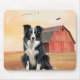A Border Collie dog sitting in a field at the ranch with a red barn and birds in flight in the background for a great country western cowboy theme that makes a delightful mouse pad for home, school, dorms and offices who enjoy western art or cowboy art.