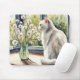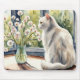 Gato branco de aquarela com buquê margarida por uma janela ensolarada