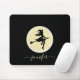 Imagem de uma silhueta de bruxa cavalgando uma vassoura em frente a uma lua brilhante. A bruxa tem cabelos longos soprando no vento, um chapéu de bruxa pontiagudo, vestido com saia e calçados de salto alto. Personalizar com nome ou mensagem na fonte do script. Colocado sobre fundo preto sólido.