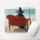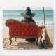 Uma bruxa com um chapéu largo sentado num sofá de veludo vermelho virado para as ondas do oceano, com uma vassoura e um par de botas deitadas na areia ao seu lado