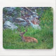 Uma fotografia de um cervo macho deitado na grama e flores silvestres que crescem entre uma parede natural de pedra em uma floresta. Esta fotografia de perto de um veado macho é a mesma grana na minha fotografia intitulada "A Buck Rest at a Cascading River". Copyright © 2018 Kimberly J Tilley.