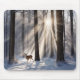 Os raios solares filtram-se majesticamente através de uma floresta coberta de neve, destacando um veado solitário em pé no meio da paisagem serena