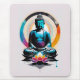Uma estátua Buda está sentada em meio a um círculo Zen colorido, com uma flor de lótus.