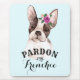 Este bocal divertido tem uma cor-de-água branca e marrom-giro e branca Bulldog Francês com um pequeno buquê de flores roxas, cor de pêssego e verdes e folhas sentadas sobre sua testa sobre um fundo azul pálido que pode ser mudado para qualquer cor que você queira. O texto personalizável diz "Perdoe meu francês".
