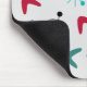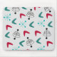 Este mouse pad tem um design atômico moderno do século médio de formas de bumerangue, antenas e estereótipos em chás, magenta, azul e preto.