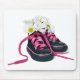 Buquê de margarida branca em tênis com cadarços cor-de-rosa em branco.