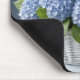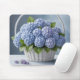 Uma cesta branca mais vadia cheia de hidrâncias azuis e roxas vibrantes repousa sobre uma superfície com flores adicionais na mesa