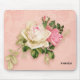 Um mouse pad com um buquê de rosa floral com flores brancas e cor-de-rosa. O fundo é rosa com um padrão floral. Bonito e elegante design.