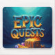 Uma pintura aquosa vibrante com a frase "Epic Quests" em uma escrita artística ousada. As letras são enfeitadas com sotaques de ouro a brilhar e rodeadas por um tesouro cheio de joias e moedas de ouro. O fundo é um fundo azul profundo, reminiscente das profundezas do oceano, acrescentando ao senso de aventura e caça ao tesouro.