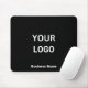 This black mousepad has a display image. You can replace the image with your business logo. A line of white display text is under the image. The text can be edited to show a custom message such as your business name. The white text is bold.