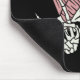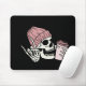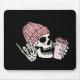 Cabeça de esqueleto com boné a gozar uma bebida numa compressa do rato.