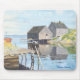 Cabanas de pesca iconicas na Cove da Peggy, NS, Canadá. Aproveite esta visão serena das operações de água e pesca. Imagem de uma pintura original de Marion Wilcox Fleming, artista e ilustradora.