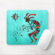 Este é um único "Um dos tipos" do mouse sudoeste de Kokopelli, que apresenta um Kokopelli sudoeste em Turquesa, Laranja e Negro, tocando flauta e dançando sob o sol em um fundo turquesa...com notas musicais! Design De Arte Original Pelo Artista Kerry Miller.