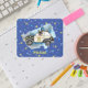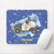 A imagem mostra um bonito cão da polícia do German shepherd K-9, dentro de um carro da polícia preto e branco, cercado por nuvens de diferentes tons de azul, com muitas estrelas como fundo em uma cor azul. O carro da polícia tem um crachá em uma porta e estrelas amarelas. Esta imagem moderna e adorável é excelente para qualquer menino com um parente na força policial. Pode ajudá-los a ensinar sobre heróis de polícias e de serviço comunitário. O mouse pad é perfeito para uso em casa ou na escola e também faz um presente de aniversário personalizado para excelente, pois você pode personalizá-lo com o nome da criança.