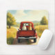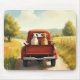 Dois cachorros sentam-se na cama de um caminhão vermelho cavalgando uma pista de terra cênica com campos amarelos e árvores verdes sob um céu azul