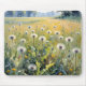 Um campo exuberante cheio de dentes-de-leão e flores silvestres se estende sob um sol brilhante, com árvores ao longo do horizonte