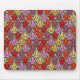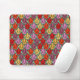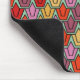 Este mouse pad tem um design de tulipas de deco de arte de pentágonos e trapezoides em laranja, vermelho, roxo, ouro e verde.