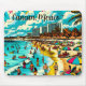 cena artística de estilo quadrinhos de pop de arte de uma praia com vibrações vintage. A Arte da IA retrata pessoas se divertindo na praia, na praia, com hotéis e apartamentos ao fundo, palmeiras bonito, guarda-chuvas coloridos e um lindo céu azul nublado em Cancún, México.
