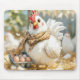 Uma galinha branca e peluda enfeitada com um cachecol floral fica orgulhosa ao lado de uma caixa de ovos