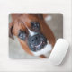 Cão novo do pugilista com pouco underbite que olha curiosa na câmera.