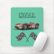 Um carro de corrida desportivo com um pano de fundo verde e bandeiras de corrida controladas abaixo e em cima de uma área onde você pode personalizá-lo para torná-lo exclusivamente seu. Vibes de carro rápido.