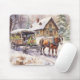 Uma cena de safra de uma casa de madeira e um vagão coberto no campo de neve de inverno com prédios e cercas antigos