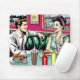 Pasta de mouse do estilo dos quadrinhos de arte retro pop. Bonito casal da era 1950 sentado num restaurante com sorrisos, batatas fritas e cheeseburgers num encontro. As cores utilizadas são o lacre, o rosa, o vermelho, o preto e o amarelo. Nostalgia antiga. Esta foto é desenhada por mim mesmo.