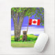 Mouse pad com meu trabalho de arte de um personagem bonitinho de castor parado debaixo de uma árvore, segurando a bandeira canadense.