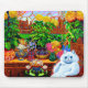 Mouse Pad com a pintura de animais de Louis Wain Master of Cat College (1860-1939). Um gato branco pensativo com olhos azuis impressionantes senta-se pesadamente ao lado de uma variedade vibrante de flores bonitas. A majestosa faculdade de gatos venta no fundo sob um céu rosa e azul. Um presente maravilhoso para amantes de gatos e arte inglesa.