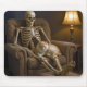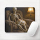 A skeleton sits in a plush armchair alongside a fluffy orange cat, both illuminated by the soft glow of a nearby lamp
