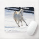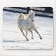 Um cavalo branco espirituoso galopando em uma pastagem de neve.