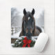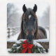 Um cavalo fica atrás de uma cerca de madeira enfeitada com uma coroa festiva e arco vermelho, cercado por uma paisagem de inverno nevada
