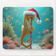Cavalo-marinho vestindo um chapéu de Papai Noel se agarra a uma cana doce em uma cena submarina