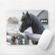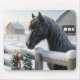 Um cavalo preto fica perto de uma cerca coberta de neve decorada com uma coroa festiva