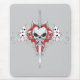 Caveira mau com presas e espada em um fundo vermelho com detalhes de rolagem e placas de jogo Ace.