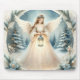 A serene celestial angel stands beneath a snowy archway of evergreens and winter florals, gently cradling a glowing lantern that spills soft golden light across her gown. Behind her, a dusky blue forest of snow-covered trees shimmers with falling flakes and tiny sparks of light, creating a peaceful, storybook atmosphere. Delicate lace details, flowing sleeves, and a halo-like crown of foliage give this winter angel illustration an ethereal, cottagecore charm that feels both nostalgic and on-trend. Soft blue and warm cream tones blend into a dreamy palette that suits spiritual holiday imagery, quiet reflection, and year-round messages of hope. This design is ideal anywhere a touch of calm, light, and heavenly beauty is desired. AI generated artwork.