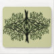 Árvore com ramos/folhas chorando. Imagem gráfica em preto com tom verde escuro. A imagem foi replicada e transformada de forma a produzir um efeito caleidoscópico. O fundo é um verde cinza.