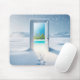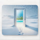 Uma porta em uma paisagem nevada revela uma praia tropical vibrante, com flocos de neve suavemente caindo ao seu redor, contrastando a cena quente dentro