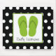 Um mousepad que caracteriza uma ilustração de um par de chinelos verdes dentro de um quadrado branco com guarnição verde. Personalize com seu nome sob chinelos. O fundo é preto com bolinhas brancas. Artigos de harmonização Look for no Paperie de Jill.