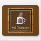 Uma renderização digital de uma xícara de chocolate quente a vapor em uma placa de parede de madeira.