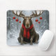 In a snowy forest, a moose sits gracefully, adorned with a bright red scarf and festive red baubles hanging from its antlers
