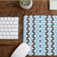 Este mouse pad apresenta um padrão geométrico colorido de herança em azul, cinza escura e branco.