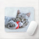 Um mouse pad com uma bela fotografia de Natal de uma cinza de gato a morder um chapéu vermelho de santa. Suas grandes patas fofinhas tornam esta foto muito encantadora.