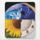 Um design quadrado compo de quatro gráficos diferentes (terra, bola de boliche, girassol, & um pulso de disparo) fazendo junto a forma de um círculo no centro