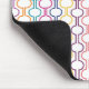 Este mouse pad tem um design de deco de arte de círculos laranja, turquesa, rosa, azul, roxo e amarelo se conectam com linhas em um campo de branco.